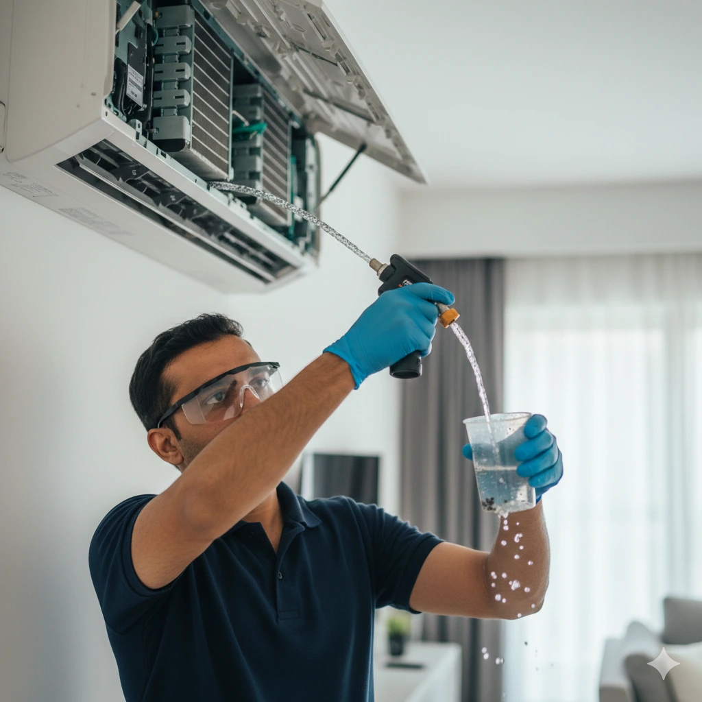 Prevent water leaks, foul odors, and AC breakdowns with professional AC Drain Flush services in Dubai. Over time, the condensate drain pipe in your AC can get clogged with dust, dirt, and algae, causing water to back up and damage your AC or property. Our expert technicians ensure your drain lines are fully cleared for smooth operation.